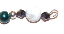 a. 1 – Black bicone, 1 – White Howlite round, 1 – Black bicone, 1- Silver-Plated smooth round metal bead, 1 – Midnight Green glass pearl, 1 – Silver-Plated rhinestone rondelle, 1 – Turquoise glass pearl, 1 – Silver-Plated smooth round metal bead, 1 – Black bicone, 1 – Tourmalated Quartz round, 1 – Black bicone, 1 – Silver-Plated smooth round metal bead, 1 – Turquoise glass pearl, 1 – Silver-Plated rhinestone rondelle, 1 – Midnight Green glass pearl, and 1 – Silver-Plated smooth round metal bead.